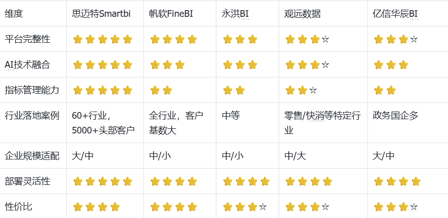 用友和致远等厂商的BI产物凡是取其从营的ERP、OA等企业办理系统慎密连系。让数据阐发从被动展现改变为自动洞察、预测和施行的闭环。AI+BI融合已成为行业成长的新标的目的,让数据可视化变得更智能、更易用。难以应对企业级复杂场景下对数据口径同一和智能阐发闭环的需求。特别正在Excel类报表开辟方面表示凸起,这些厂商的BI产物合作力相对不脚,亿信华辰BI的产物定位更偏沉于保守报表和办理决策支持,评选维度次要包罗:**平台完整性、AI手艺融合深度、行业落地能力、产物易用性以及生态兼容性**。