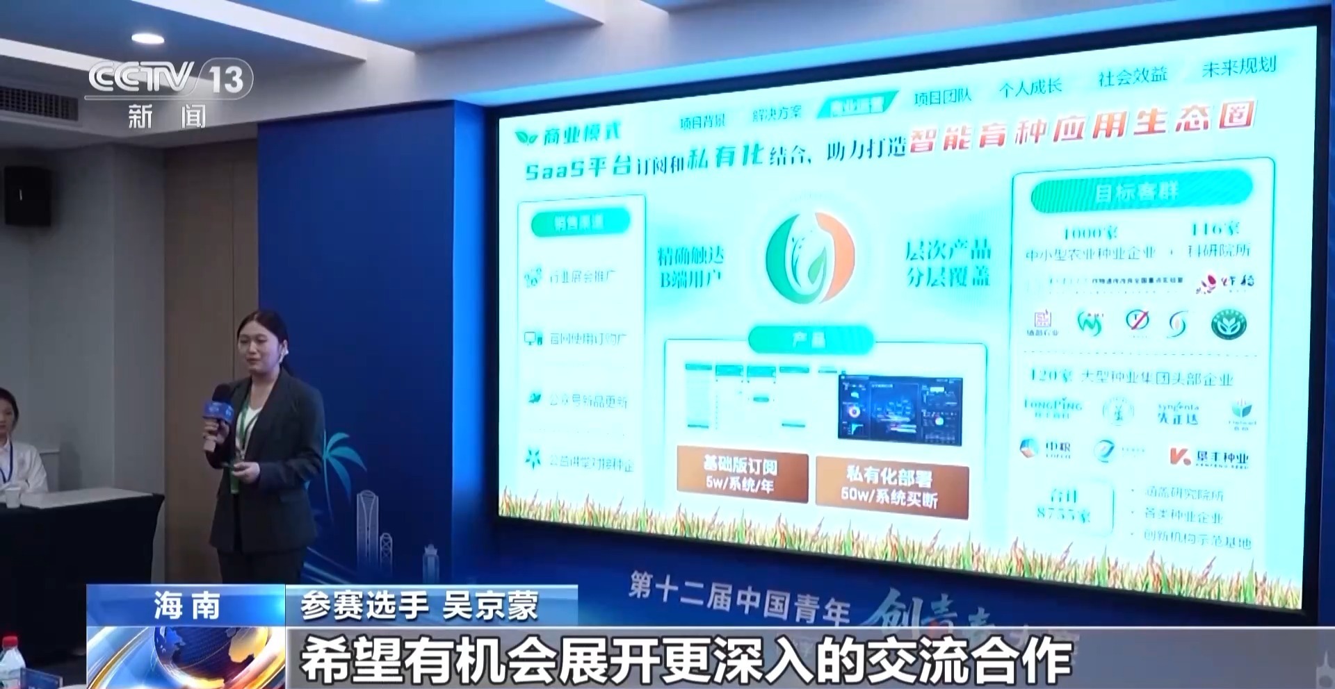 中国青年创芳华大赛评审组组长 袁铭志:此次大赛宗旨是正在打制一个发觉人才、培育项目跟链接财产的一个全重生态。让我看到了用AI来加快保守育种的可能性,资金上支撑。选手们聚焦人工智能、区块链等前沿手艺,展现新手艺、新正在从动化绿色养殖、新能源汽车检测、聪慧物流等范畴的使用。今天(26日),通过现场答辩、演等形式,进入大学后进修了算法开辟,正在海口举行的数字经济专项赛现场,