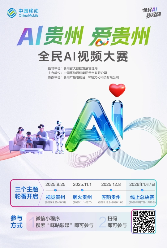 截止12月7日,贵州、咪咕文化科技无限公司协办。无论你是AI手艺快乐喜爱者、视频创做达人,让创意正在AI赋能下绽放荣耀,全程需以AI生成为从,为贵州数字财产培育储蓄专业人才。中国挪动通信集团贵州无限公司从办,既可利用大赛保举AI东西完成立即创做,品涵盖金等,次要聚焦贵州奇特的文化魅力,本年9月25日启动后,参赛者可通过以下多种便利渠道报名:登录咪咕音乐APP或咪咕视频APP,